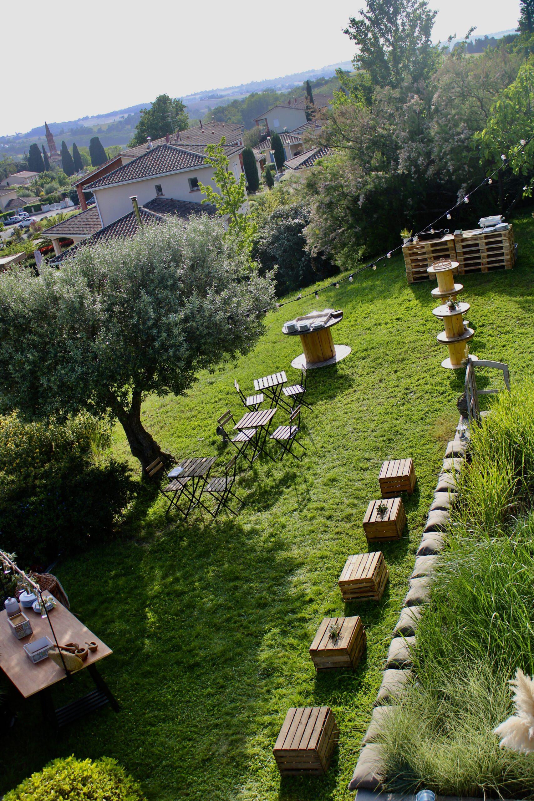 Laura souhaitait aussi une décoration avec des palettes, des bars à fabriquer elles-mêmes. Je leur ai proposé des solutions plus faciles à bricoler que les images Pinterest qu’elles avaient trouvées, pour correspondre au terrain en pente de la maison.