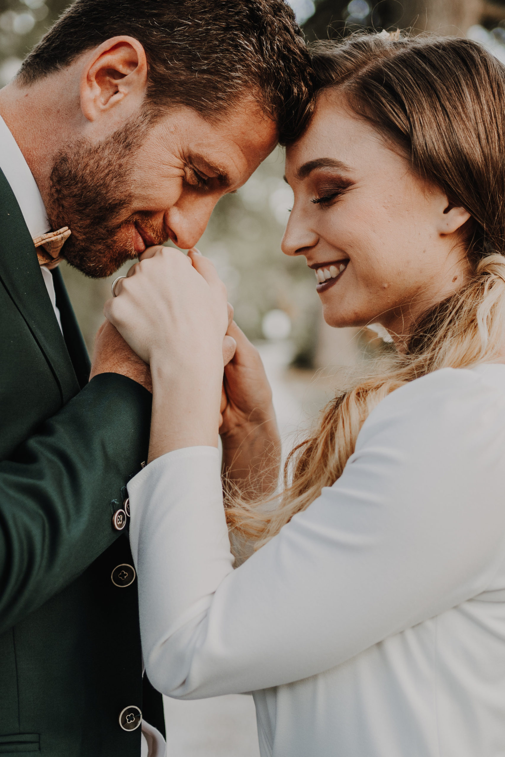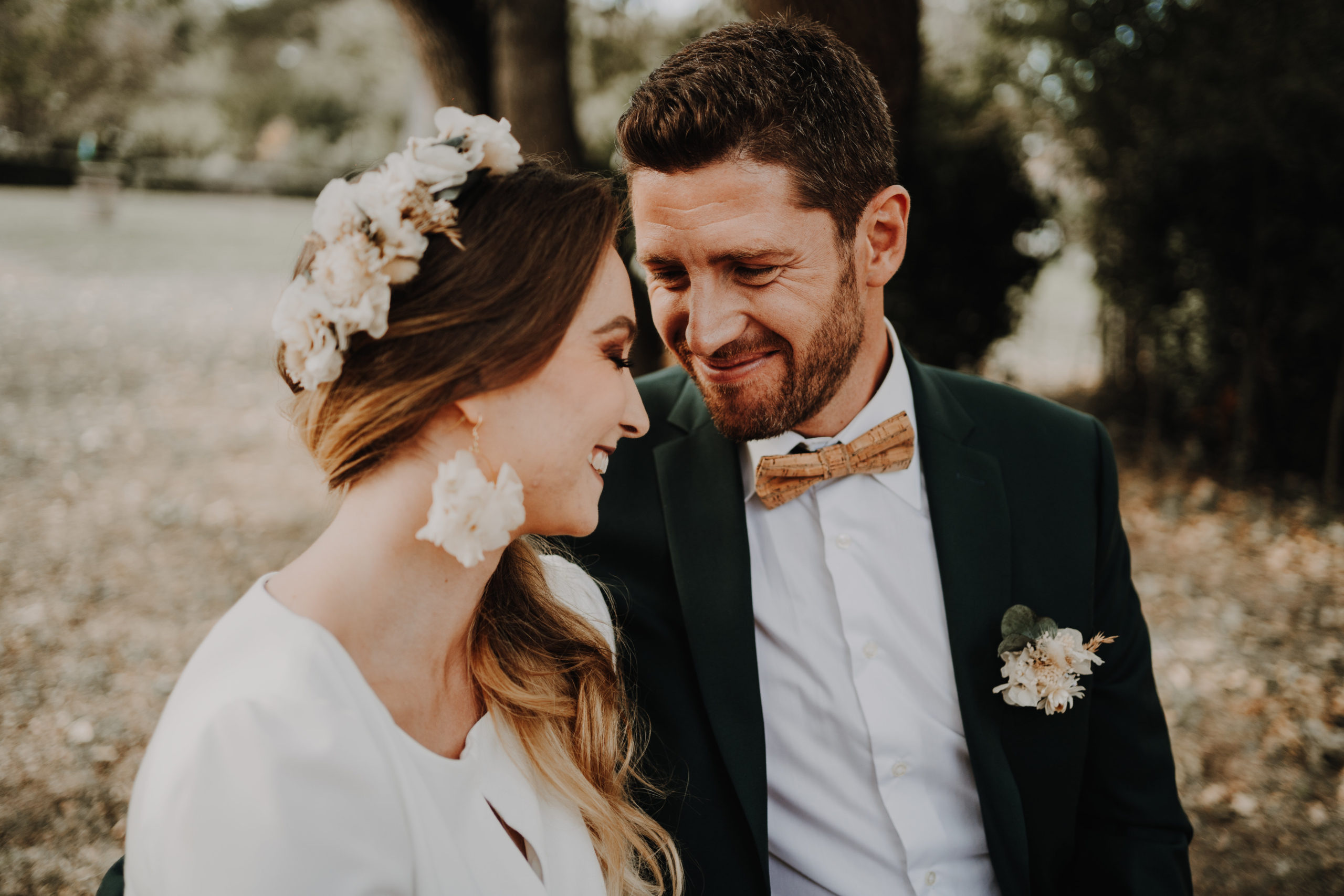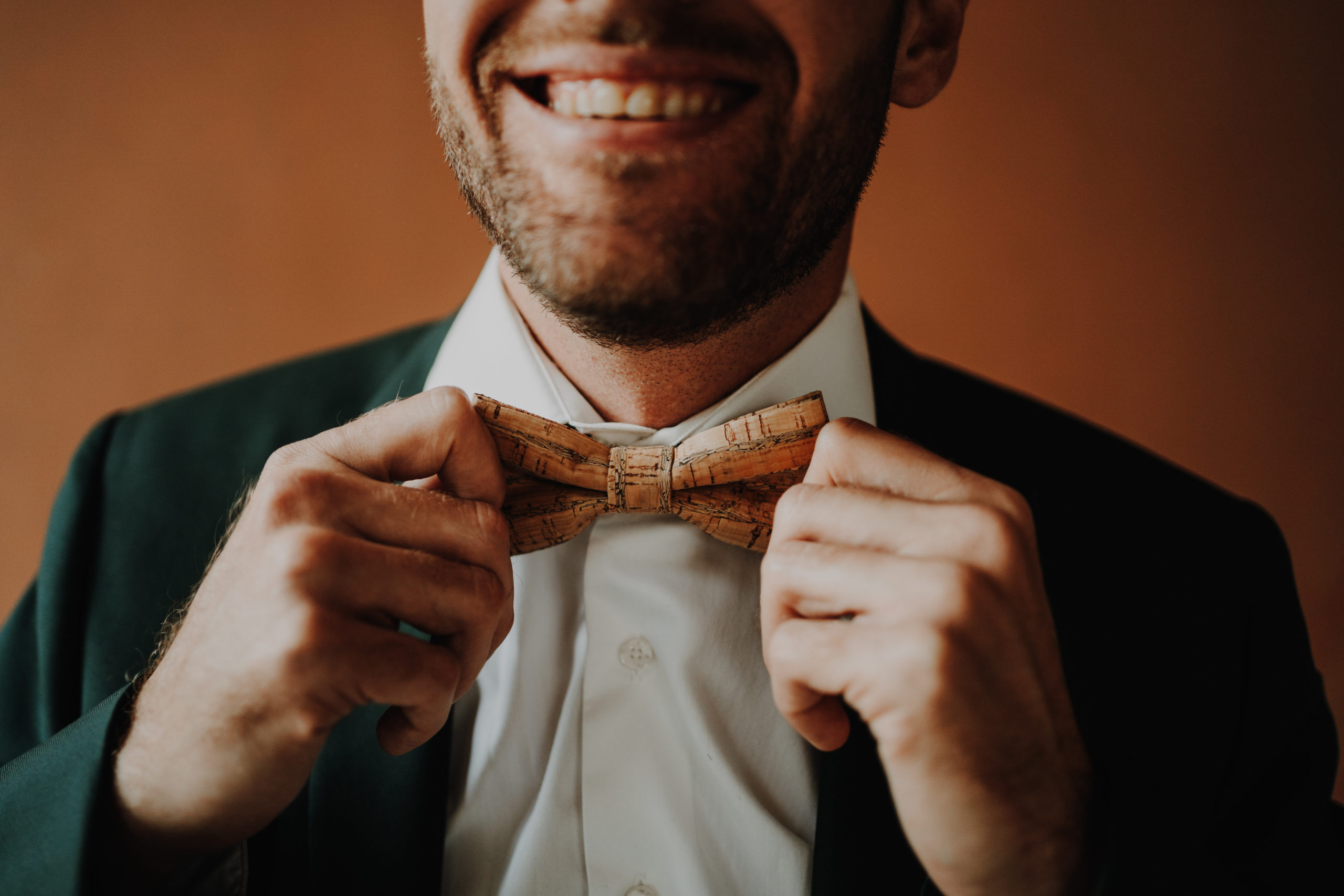 Une robe de mariée sans fioriture élégante et très chic, une coiffure simple mais raffinée et bien ornée loin des chignons classiques. Un costume couleur forêt et un nœud papillon en liège comme un rappel à la nature.