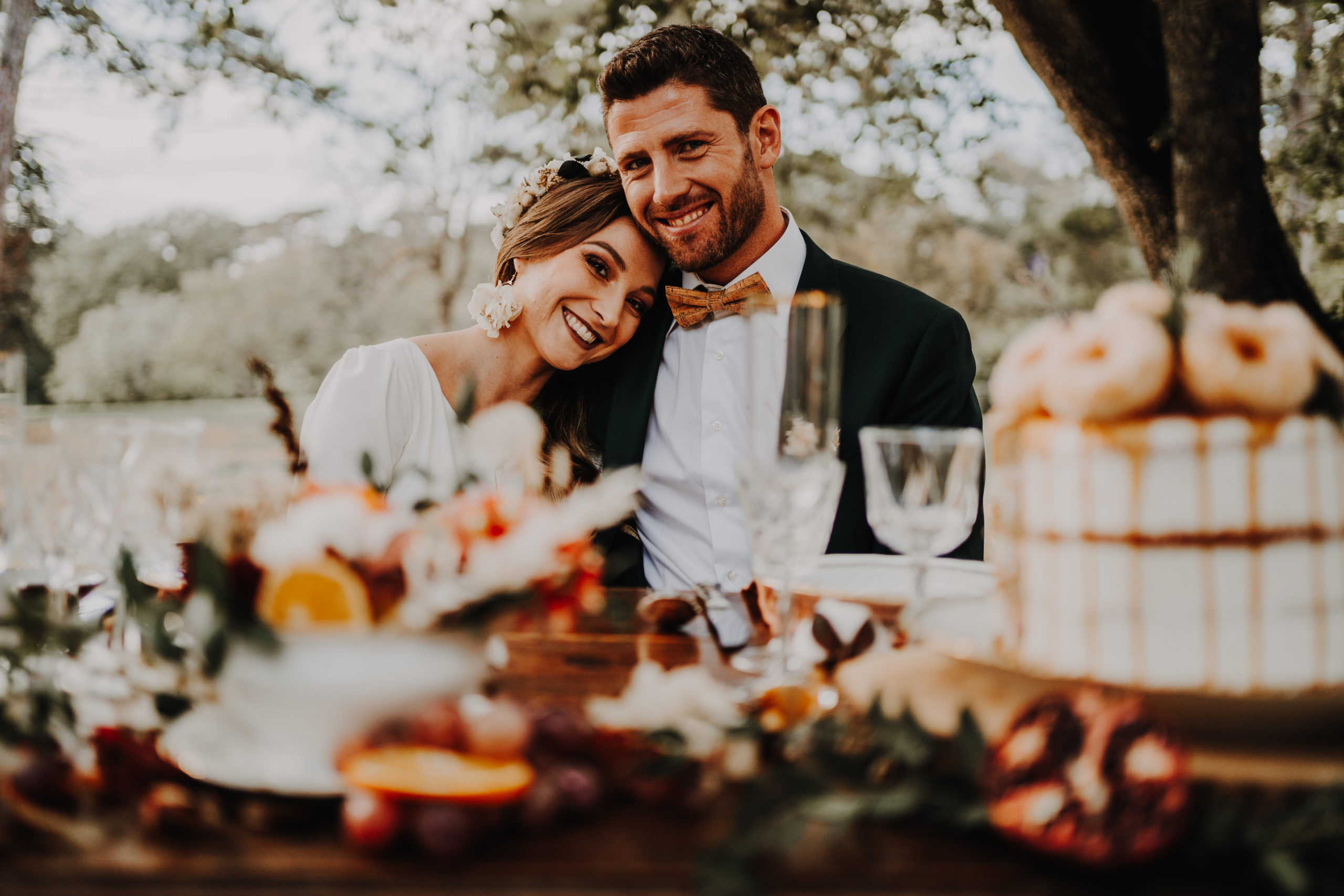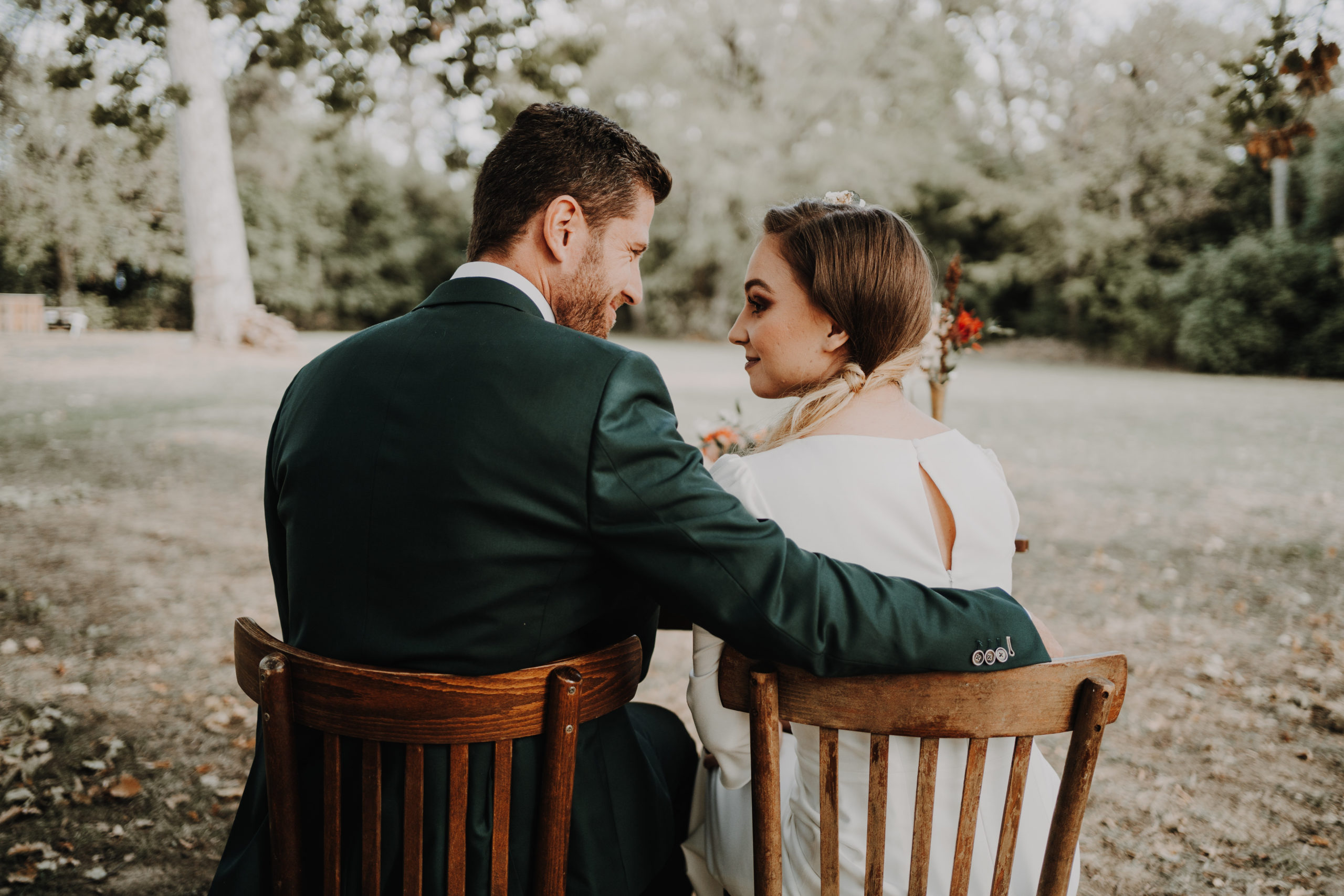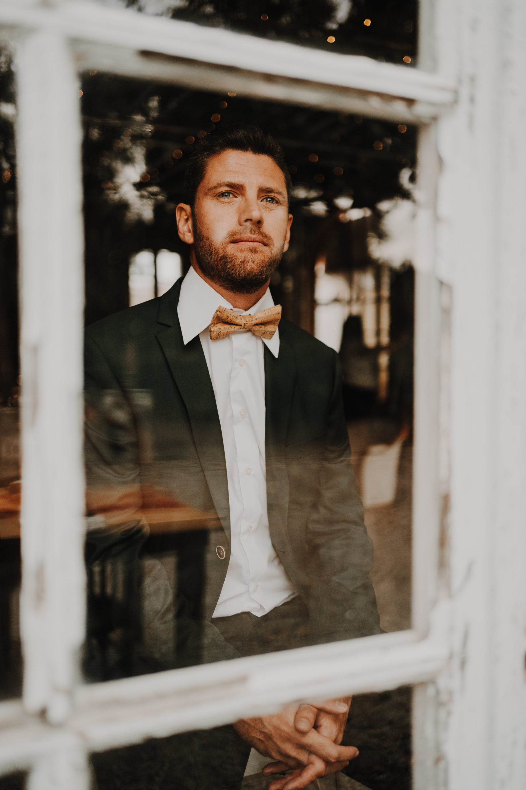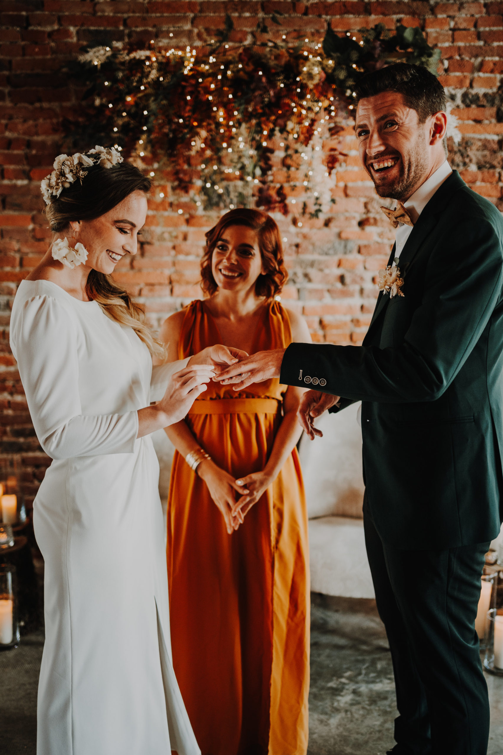 Une robe de mariée sans fioriture élégante et très chic, une coiffure simple mais raffinée et bien ornée loin des chignons classiques. Un costume couleur forêt et un nœud papillon en liège comme un rappel à la nature.