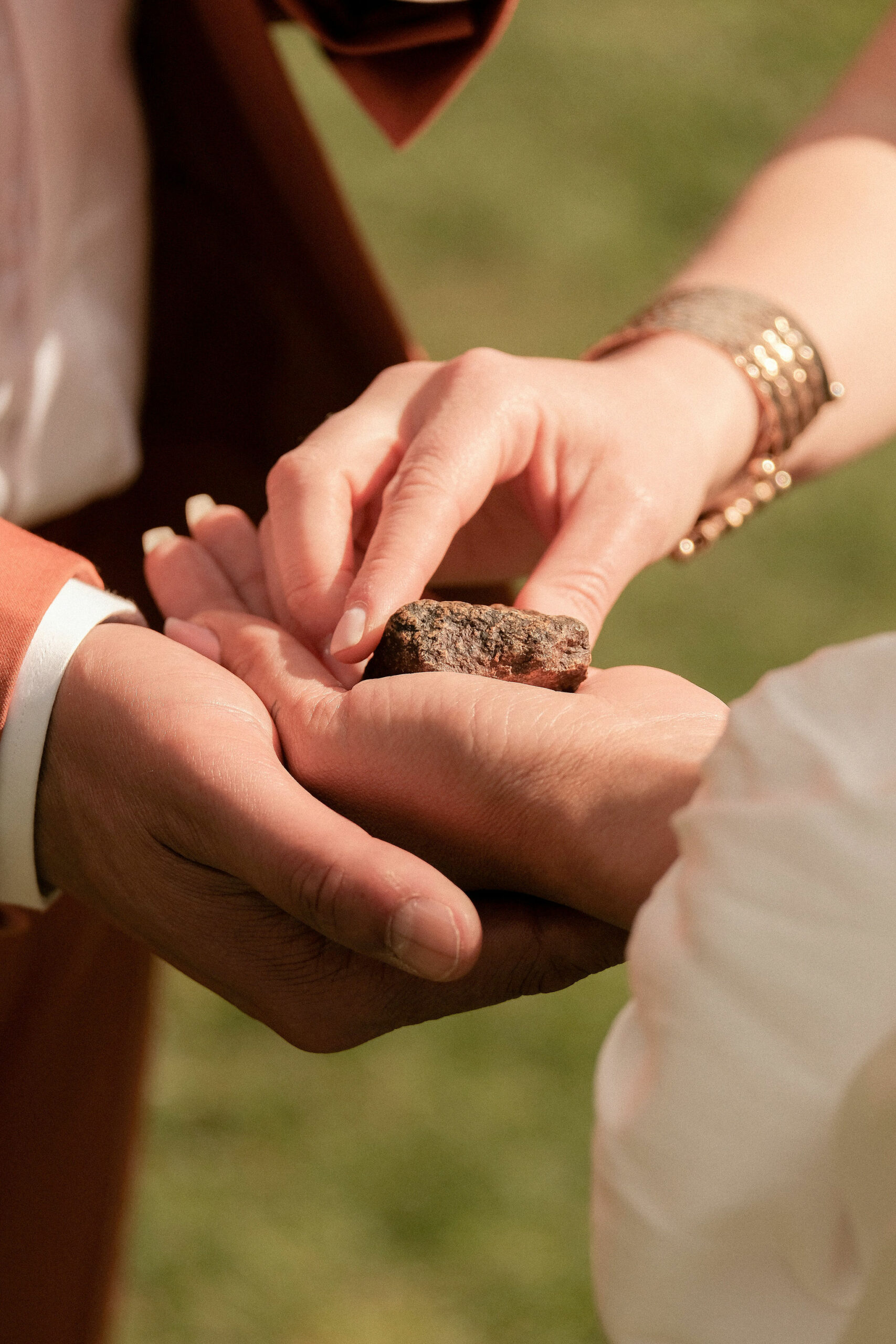 Le rituel de la pierre de serment tire ses origines dans la tradition celte. Les marié.es prennent la pierre entre leurs mains au moment de la prononciation de leurs vœux et la légende dit qu’ils seront ainsi gravés dans la pierre.